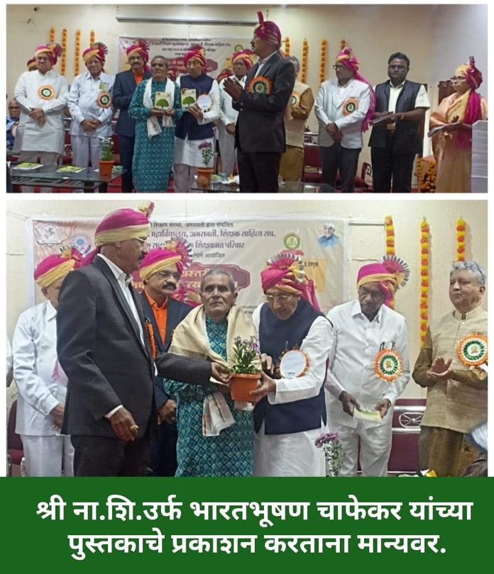 अमरावती(दि.20जानेवारी):- येथील मातोश्री विमलाबाई देशमुख साहित्य नगरी श्री.शिवाजी शिक्षण महाविद्यालय,अमरावती येथे नुकत्याच संपन्न झालेल्या ९ व्या राज्यस्तरीय शिक्षक साहित्य संमेलनात लेखक व कवी ना.शि.उर्फ भारतभूषण चाफेकर यांच्या ” शिवसस्था वटवृक्ष: विस्तारलेलं क्षितिज ” या ग्रंथाचे प्रकाशन उद्घाटक हर्षवर्धन देशमुख, अध्यक्ष,श्री शिवाजी शिक्षण, संस्था,अमरावती. संमेलनाध्यक्ष प्रा.डॉ.गणेश चव्हाण (सुप्रसिद्ध साहित्यिक),या ग्रंथाचे प्रस्तावनाकार प्रा.अरुण बाबारावजी बुंदेले, स्वागताध्यक्ष ॲड. जे. व्ही. पाटील (पुसदेकर), ॲड.गजाननराव पुंडकर, प्रा. वसंतराव पुरके,पदवीधर आमदार धीरज लिंगाडे, डॉ. श्रीकांत तिडके, ज्येष्ठ साहित्यिक हेमंत डोणगावकर, डॉ.पूनम चव्हाण, प्राचार्य डॉ. विनय राऊत,मा.जयदीप सोनखासकर,मा.शरदचंद्र बिडकर, प्राचार्य डॉ.अतुल ठाकरे, प्रा.डॉ. किशोर क्षत्रीय यांच्या हस्ते थाटात प्रकाशन संपन्न झाले.