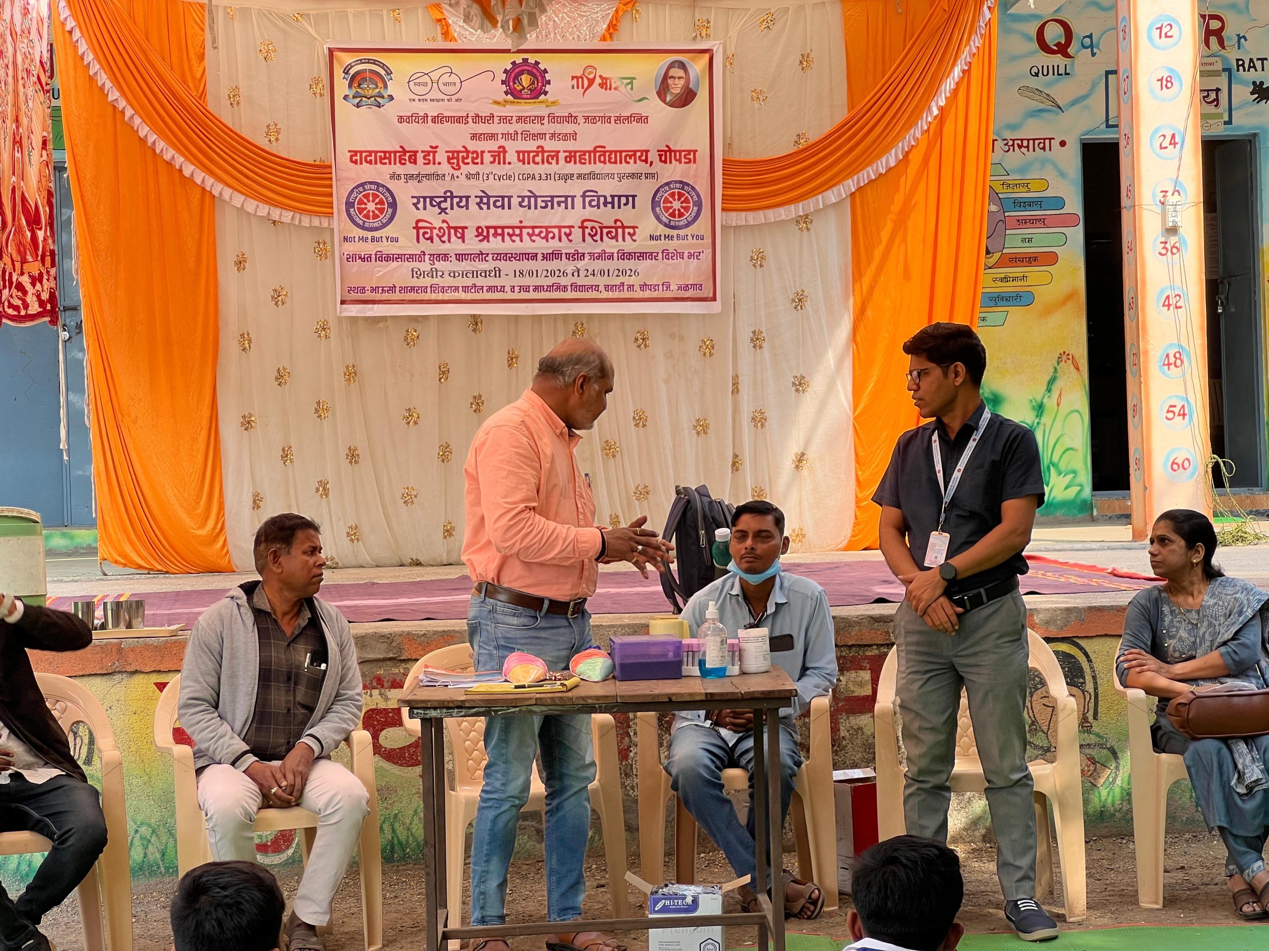 चोपडा(दि.23जानेवारी):-येथील महात्मा गांधी शिक्षण मंडळाचे दादासाहेब डॉ. सुरेश जी.पाटील महाविद्यालयातील राष्ट्रीय सेवा योजना हिवाळी श्रमसंस्कार शिबिर शामराव शिवराम माध्यमिक उच्च माध्यमिक विद्यालय चहार्डी ता. चोपडा येथे आयोजित करण्यात आले आहे. दिनांक 20 जानेवारी रोजी सकाळी 11 ते 12 या दरम्यान राष्ट्रीय सेवा योजना वतीने चहार्डी गावातील विद्यार्थ्यासाठी तसेच राष्ट्रीय सेवा योजना स्वयंसेवकांसाठी सिकलसेल रक्त चाचणी तपासणी अभियान आयोजित करण्यात आले. या  अभियानात 100 पेक्षा अधिक स्वयंसेवकांनी सहभागी होऊन आपली सिकलसेल रक्ताची चाचणी करून घेतली. तसेच शामराव शिवराम माध्यमिक व उच्च माध्यमिक विद्यालयातील 30 पेक्षा अधिक विद्यार्थ्यानी या अभियानात सामील होऊन आपल्या सिकलसेल रक्ताची चाचणी केली .सदर अभियानासाठी चहार्डी येथील ग्रामीण रुग्णालयाचे विशेष सहकार्य मिळाले.