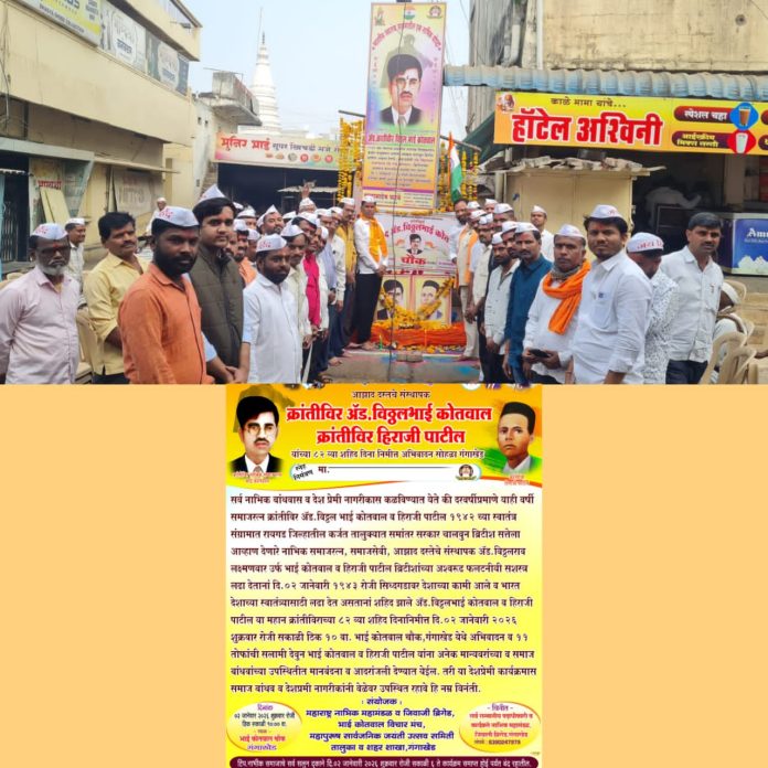 गंगाखेड(दि.5जानेवारी):- शहरातील नाभिक समाजाच्या वतीने आझाद दस्तचे संस्थापक क्रांतिवीर विठ्ठलभाई कोतवाल व क्रांतिवीर हिराजी पाटील यांच्या ८२ व्या शहीद दिनानिमित्त (दिनांक ०२ जानेवारी शुक्रवार) रोजी अभिवादन कार्यक्रमाचे आयोजन करण्यात आले होते.शहरातील क्रांतिवीर विठ्ठलभाई कोतवाल चौक येथे देशभक्तीच्या वातावरणात अभिवादन कार्यक्रम पार पडला.