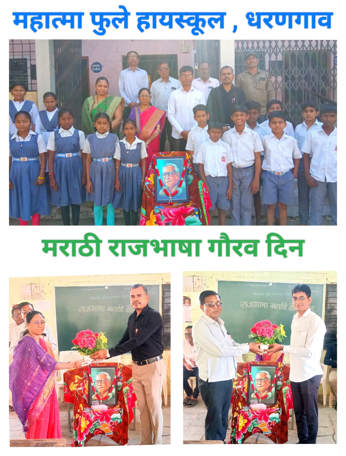 धरणगाव(दि.27फेब्रुवारी):- शहरातील सुवर्ण महोत्सवी शाळा महात्मा फुले हायस्कूल धरणगाव येथे २७ फेब्रुवारी “मराठी राजभाषा गौरव दिन ” मोठ्या उत्साहात साजरा करण्यात आला. याप्रसंगी कार्यक्रमाचे प्रास्ताविक पी डी पाटील यांनी केले.