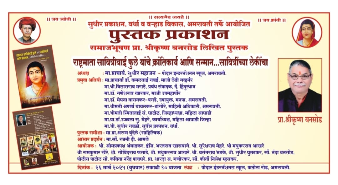 अमरावती(दि.23):-सुधीर प्रकाशन,वर्धा व वऱ्हाड विकास,अमरावती तर्फे आयोजित फुले – शाहू – आंबेडकरी चळवळीला गतिमान करणारे समता सैनिक समाजभूषण प्रा.श्रीकृष्ण बनसोड यांच्या ” विद्रोही महात्मा” व ” महात्मा फुले आणि अस्पृश्यांची कैफियत ” या दोन्ही पुस्तकांना राज्यातील पुरोगामी विचारांच्या वाचकांनी भरभरून प्रतिसाद दिल्यानंतर त्यांचे दहावे पुस्तक ” राष्ट्रमाता सावित्रीबाई फुले यांचे क्रांतिकार्य आणि सन्मान सावित्रींच्या लेकींचा ” या पुस्तकाचा प्रकाशन समारंभ दि.२६ मार्च २०२५ (बुधवार) ला पोदार इंटरनॅशनल स्कूल,कठोरा रोड,अमरावती येथे संपन्न होत आहे.