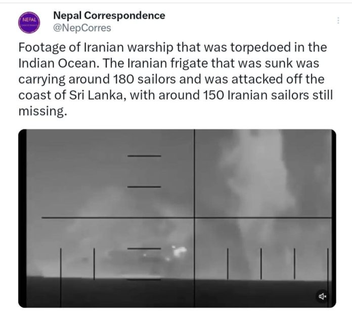 इराणी नौसेनेची फ्रिगेट देना अमेरिकन पाणबुडीने डागलेल्या टॉरपेडो मुळे श्रीलंकेच्या समुद्रात बुडाली. विशाखापट्टणम येथे भारतीय नौदलाने आयोजित केलेल्या “मिलन २०२६” या बहुदेशीय अभ्यासानंतर इराणकडे जाताना या लढाऊ जहाजावर अमेरिकन पाणबुडीने हा हल्ला केला. यात ४० नौसैनिक श्रीलंकन सैन्याने वाचवले आणि १०० पेक्षा जास्त सैनिक मारले गेले. अमेरिकन युद्धमंत्री हेगसेथ याने हा हल्ला केल्याची कबुली दिली.