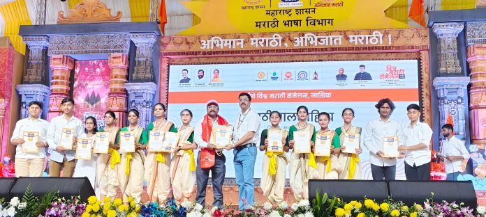 जळगाव(दि.९मार्च):- महाराष्ट्र शासनाच्या मराठी भाषा विभागातर्फे चौथे विश्व मराठी संमेलन नाशिक येथे आयोजित करण्यात आले होते. या संमेलनाला जगभरातून १९ देशातील मराठी भाषिक नागरिक सहभागी झाले होते. तीन दिवस चाललेल्या या संमेलनाच्या तिसऱ्या दिवशी बालरंगभूमी परिषदतर्फे अनुभूती इंग्लिश मिडीयम स्कूलच्या विद्यार्थिंनींनी सहभाग घेत बहारदार कातकरी नृत्य सादर केले.