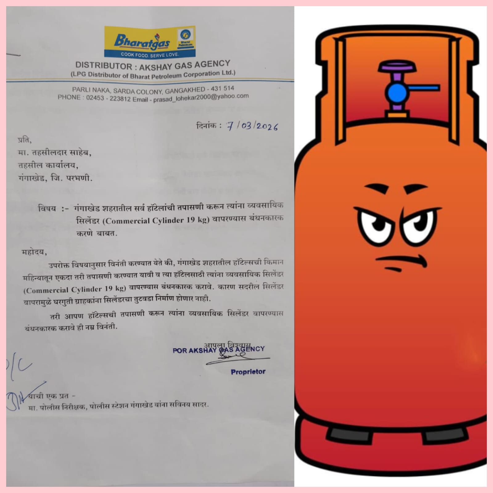 प्रशासनाने शहरातील सर्व हॉटेलांची नियमित तपासणी करून त्यांना व्यावसायिक गॅस सिलेंडर १९ किलो वापरणे सक्तीचे करावे,अशी मागणी करण्यात आली आहे.महिन्यातून किमान एकदा तपासणी मोहीम राबविण्याची गरजही व्यक्त करण्यात आली आहे.निवेदनाची प्रत गंगाखेड पोलीस ठाण्यालाही सादर केली असून,संबंधित विभागांनी याकडे गांभीर्याने लक्ष देऊन कारवाई करावी,अशी अपेक्षा व्यक्त करण्यात आली आहे.
