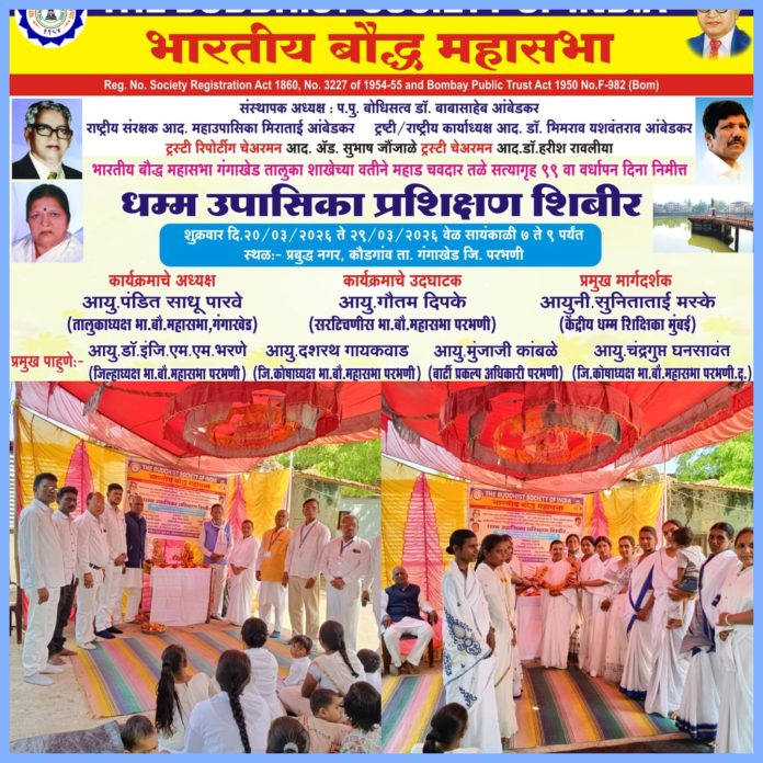 गंगाखेड(दि.23मार्च):-भारतीय बौद्ध महासभा तालुका शाखा गंगाखेड,समता सैनिक दल आणि संघमित्रा महिला मंडळ,कौडगाव यांच्या संयुक्त विद्यमाने प्रबुद्ध नगर,कौडगाव येथे दहा दिवसीय धम्म उपासिका प्रशिक्षण शिबिराचा शुभारंभ (दिनाक २० मार्च शनिवार) रोजी करण्यात आला. सदरील शिबिर दिनांक २९ मार्च पर्यंत चालणार आहे.
