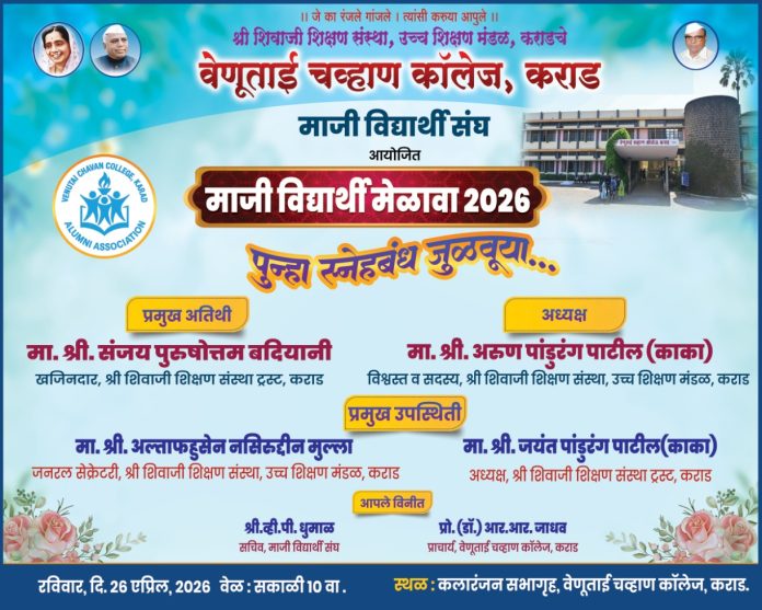 तसेच, विविध शैक्षणिक व सहशालेय उपक्रमांच्या माध्यमातून विद्यार्थ्यांना जागतिक स्तरावर स्पर्धा करण्यासाठी सक्षम बनविण्याचा सातत्याने प्रयत्न केला जात आहे. त्यामुळे वेणूताई चव्हाण कॉलेज हे केवळ शिक्षणसंस्था न राहता विद्यार्थ्यांचे उज्ज्वल भविष्य घडवणारे एक प्रेरणादायी केंद्र ठरत आहे. या आठवणींना उजाळा देण्यासाठी माजी विद्यार्थी संघाच्या वतीने “माजी विद्यार्थी मेळावा” रविवार दिनांक 26 एप्रिल 2026 रोजी आयोजित करण्यात येत आहे. “पुन्हा स्नेहबंध जुळवूया…” या संकल्पनेवर आधारित हा मेळावा पार पडणार असून, महाविद्यालयाच्या स्थापनेपासून ते आज पर्यंत च्या विविध वर्षांतील माजी विद्यार्थ्यांना एकत्र आणून जुन्या आठवणींना उजाळा देणे, तसेच परस्परांमधील स्नेह अधिक दृढ करणे हा या उपक्रमाचा मुख्य उद्देश आहे.