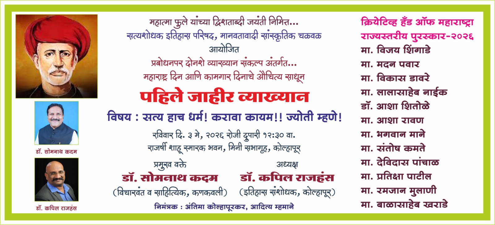 कोल्हापूर(दि.30एप्रिल):-महात्मा जोतिराव फुले यांच्या द्विशताब्दी जयंती निमित्त सत्यशोधक इतिहास परिषद आणि मानवतावादी सांस्कृतिक चळवळ यांच्या वतीने पुढील वर्षभर प्रबोधनपर दोनशे व्याख्यानांचा संकल्प करण्यात आला असून या अंतर्गत महाराष्ट्र दिन आणि कामगार दिनाचे औचित्य साधून सत्य हाच धर्म! करावा कायम!! ज्योती म्हणे! या विषयावर कणकवलीचे विचारवंत व साहित्यिक डॉ. सोमनाथ कदम यांचे पहिले जाहीर व्याख्यान रविवार दि. 3 मे, 2026 रोजी दुपारी 12:30 वा. राजर्षी शाहू स्मारक भवन, मिनी सभागृह, कोल्हापूर या ठिकाणी आयोजित केले असून कोल्हापूरचे इतिहास संशोधक डॉ. कपिल राजहंस हे या कार्यक्रमाचे अध्यक्ष असणार आहेत.