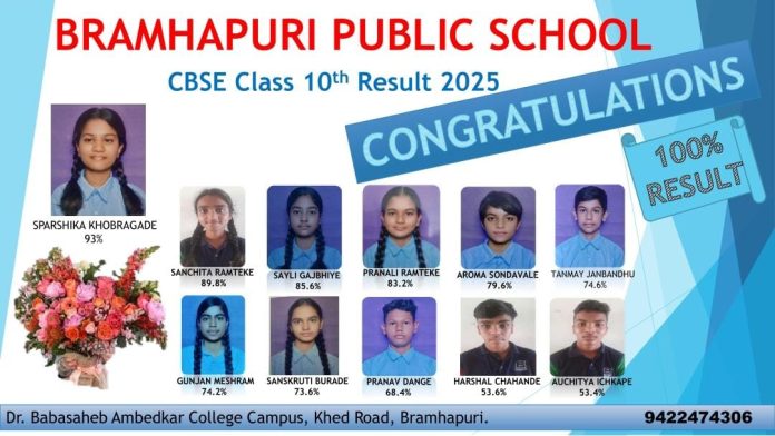 ब्रम्हपुरी(दि.13मे):- नुकत्याच वर्ग दाहावीच्या CBSE बोर्ड च्या घोषित झालेल्या निकालामध्ये ब्रम्हपुरी पब्लिक स्कुल ब्रह्मपुरी येथील कु. स्पर्शिका सचिन खोब्रागडे – 93% घेऊन विद्यालयात प्रथम आली.