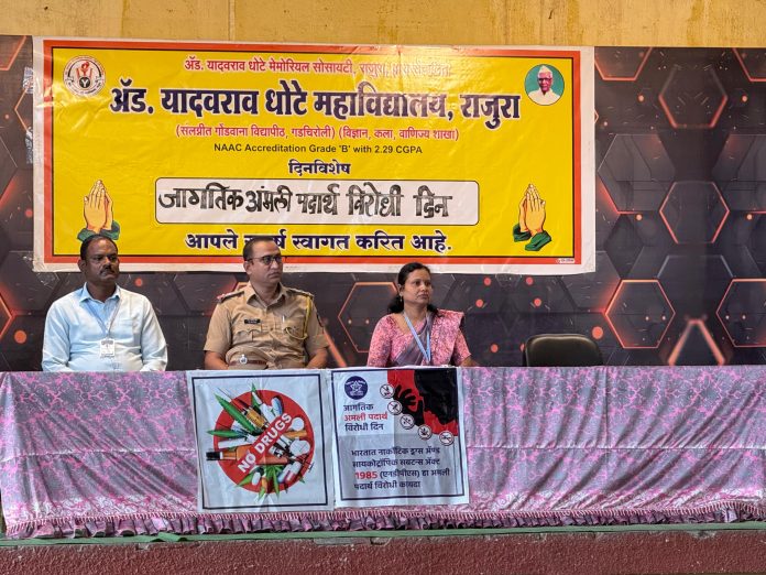 यानंतर “जागतिक अमली पदार्थ विरोधी दिन” या उपक्रमाअंतर्गत विशेष कार्यक्रम घेण्यात आला. प्रमुख पाहुणे म्हणून ए.पी.आय. हेमंत पवार व संघपाल गेडाम (पोलीस स्टेशन, राजुरा) उपस्थित होते. त्यांनी विद्यार्थ्यांना अमली पदार्थांचे दुष्परिणाम, त्याचा तरुणाईवर होणारा परिणाम याविषयी सखोल माहिती दिली.