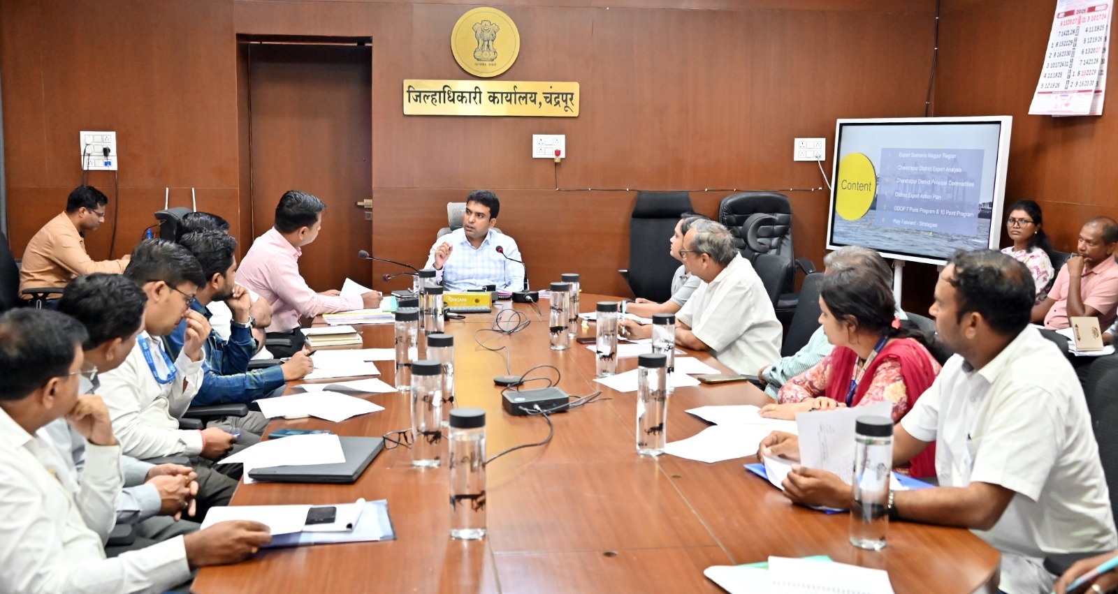 चंद्रपूर जिल्ह्यातील मागील वर्षी 20 टक्क्यांनी वाढलेली निर्यात व यावर्षी निर्यात वाढीकरीता उपाययोजना करणे, तसेच ‘एक जिल्हा एक उत्पादन’ अंतर्गत जिल्ह्यातील तांदूळ आणि बांबू प्राधान्याने निर्यात व्हावे, याबाबत आढावा घेण्यात आला. चंद्रपूरमध्ये टेस्टिंग लॅब, मुल येथे लॉजिस्टिक हब तसेच बँक ऑफ इंडिया, चंद्रपूर येथे परकीय चलन कक्ष प्रस्तावित असून चंद्रपूर जिल्ह्यातील निर्यात वाढीकरीता खुप फायदेशीर ठरणार असल्याचे जिल्हा उद्योग केंद्राचे महाव्यवस्थापक ऋतुराज सुर्या यांनी सांगितले.