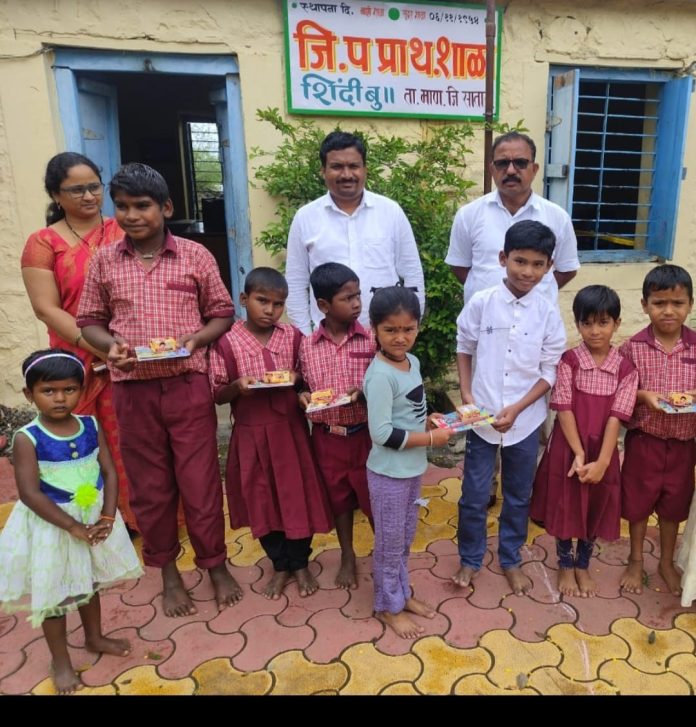 म्हसवड /सातारा(दि.6जुलै):- सामाजिक कार्यकर्ते किरण खरात यांच्या वाढदिवसाचे निम्मिताने त्यांचे मित्र समूह चे वतीने अनेक सामाजिक उपक्रम राबविणेत आले यामध्ये सालाबाद प्रमाणे प्रामुख्याने शिंदी बुद्रक येथील प्राथमिक शाळेच्या सर्व विद्यार्थ्यांना शैक्षणिक साहित्य तसेच खाऊ वाटप करणेत आले. यावेळी सर्व विद्यार्थी व शिक्षक उपस्तिथ होते.याच बरोबर एहसास मतिमंद स्कूल वळसे येथील विद्यार्थ्यांना भोजनदान देखील करणेत आले. आपले वाढदिवसाचे निम्मिताने सातारा जिल्ह्याची सुपुत्री राष्ट्रीय धावपटू पोलीस कन्या कु. सुदेष्णा शिवणकर हिस पुढील वाटचालीसाठी छोटीशी मदत तिच्या वडिलांकडे सुपूर्द करणेत आली.
