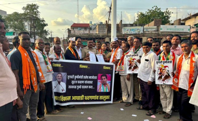 धरणगांव(दि.21जुलै):- विधिमंडळात रमी खेळणाऱ्या कृषिमंत्र्यांनी तात्काळ राजीनामा द्यावा तसेच शेतकरी पुत्रांना अमानुष मारहाण करणाऱ्या राष्ट्रवादी अजित पवार गटाच्या सूरज चव्हाणवर गुन्हा दाखल करण्यात यावा यासाठी धरणगावात महाविकास आघाडीतर्फे आंदोलन करण्यात आले.