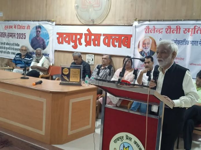 वरिष्ठ अधिवक्ता, लेखक और संविधान विशेषज्ञ कनक तिवारी ने भी इस अवसर पर विचारोत्तेजक वक्तव्य दिया। उन्होंने स्वयं को गांधीवादी-वामपंथी और कॉमरेड बताते हुए कहा कि संविधान में “हम भारत के लोग” संप्रभु हैं, न कि कोई राष्ट्रपति, प्रधानमंत्री या अन्य कोई अधिकारी। यह आंबेडकर ही थे, जिन्होंने प्रेस की आजादी को नागरिक आजादी से जोड़ा और उन्होंने ही देश को लोकतांत्रिक गणराज्य बनाया। उन्होंने कहा कि आजादी के आंदोलन के दौरान प्रेस ने बड़ी कुर्बानियां दी थीं और उस समय गांधीजी सबसे बड़े पत्रकार थे।आज इस पत्रकारिता पर जो खतरा है, वह अजीत अंजुम और हेमंत मालवीय पर हो रहे हमलों के रूप में देखा जा सकता है। उन्होंने कहा कि देश में लोकतंत्र और अंबेडकर के संविधान की रक्षा करके ही जन पक्षधर पत्रकारिता को बचाया जा सकता है।