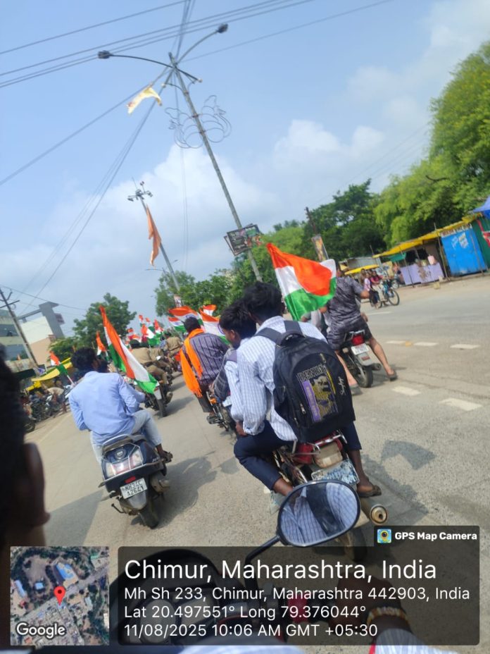 चिमूर- नागरिकांमध्ये भारतीय तिरंग्याशी वैयक्तिक आणि भावनिक संबंध निर्माण करण्यास प्रोत्साहित करण्यासाठी तसेच राष्ट्रीय ओळख, देशभक्ती आणि अभिमानाची एक यशस्वी जनभागीदारी चळवळ निर्माण करण्याकरिता, केंद्रीय गृहनिर्माण तथा शहरी कार्य मंत्रालय, भारत सरकार द्वारा देशभरात ‘हर घर तिरंगा’- ‘हर घर स्वच्छता’ ही मोहीम सुरू केलेली आहे. या मोहिमेच्या एक भाग म्हणून चिमूर नगरपरिषद क्षेत्रातील नागरिकांमध्ये ‘हर घर तिरंगा’- ‘हर घर स्वच्छता’ मोहिमेची जनजागृती करण्याकरिता, दिनांक 11 ऑगस्ट 2025 रोज सोमवारला सकाळी 9:00 वाजता, नगरपरिषद चिमूर द्वारा जनजागृती बाईक रॅली आयोजित करण्यात आली होती. या रॅली मध्ये ग्रामगीता महाविद्यालय, चिमूरचे विद्यार्थी उत्साहाने सहभागी झाले. या रॅली ची सुरुवात राष्ट्रसंत तुकडोजी महाविद्यालया पासून करण्यात आली तसेच रॅली चा समारोप हुतात्मा स्मारक येथे करण्यात आली. या रॅलीत मोठ्या संख्येने चिमूर चे नागरिक, विद्यार्थी आणि नगरपरिषद चे कर्मचारी उपस्थित होते.