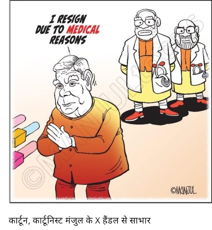 यहाँ सवाल सिर्फ व्यक्ति धनखड़ या उनके किये-धरे का नहीं है – यहाँ सवाल संसदीय लोकतंत्र पर मंडरा रहे तानाशाही के घने, गहरे और आशंकाओं से भरे मेघों का है। तत्कालीन उपराष्ट्रपति हामिद अंसारी के विदाई भाषण में असभ्य और अभद्र तानाकशी और उनकी मुस्लिम पृष्ठभूमि और विदेश सेवाओं में तैनाती का हवाला देकर स्वयं मोदी द्वारा की गयी कुटिल साम्प्रदायिक टिप्पणी आज भी भारत के संसदीय इतिहास में एक शर्मनाक अध्याय है। राज्यसभा में अंसारी को विदाई देते हुए अपनी विषाक्त टिप्पणी में मोदी ने कहा था कि “हो सकता है कि कार्यकाल के दौरान उनके अंदर कुछ छटपटाहट रही हो, लेकिन यह संकट आज के बाद नहीं रहेगा।“ सीधे-सीधे सांप्रदायिक टिप्पणी करते हुए यह भी कहा था कि “आपके कार्यकाल का बहुत सारा हिस्सा वेस्ट एशिया से जुड़ा रहा है बतौर डिप्लोमैट। उसी दायरे में जिंदगी के बहुत सारे आपके वर्ष गए। उसी माहौल में, उसी सोच में, उसी डिबेट में ऐसे लोगों के बीच रहे। वहां से रिटायर होने के बाद भी ज्यादातर काम वही रहा, चाहे माइनॉरिटी कमीशन हो या अलीगढ़ यूनिवर्सिटी हो। … लेकिन ये 10 साल पूरी तरह एक अलग तरह का जिम्मा आपके पास आया… हो सकता है कुछ छटपटाहट रही होगी आपके अंदर भी, लेकिन आज के बाद शायद आपको वैसा संकट नहीं रहेगा… मुक्ति का आनंद भी रहेगा… और अपने मूलभूत जो सोच रही होगी, उसके अनुसार कार्य करने, सोचने का और बात बताने का अवसर भी मिलेगा।’’ ध्यान रहे कि राज्यसभा के पदेन सभापति होने के नाते खुद हामिद अंसारी इस दौरान सदन का संचालन कर रहे थे। जो उस समय खामोश थे – वे आज इस उपराष्ट्रपति के अपमान के समय सकते में हैं। मगर न ख़ामोशी कारगर होती है, न ही सिर्फ चौंकना भर ही काफी होता है ; इस पूरे काण्ड में सिर्फ एक ही बात सही है और वह यह कि “स्वास्थ्य खराब है”, मगर उन जगदीप धनखड़ का नहीं, जिनका बताया गया है – भारत के लोकतंत्र की सेहत खराब है। बिहार में एसआईआर – सर – के नाम पर जो सुरसुरी दिख रही है, वह इसी का एक लक्षण है, समग्रता में यह बीमारी कहीं ज्यादा सांघातिक है।
