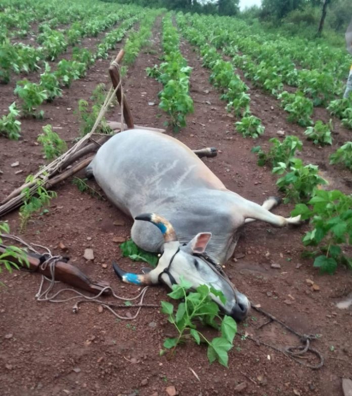 पाचगाव येथील चंद्रभान चौधरी यांच्या शेतात कामावर असलेल्या मधुकर तुकाराम सोयाम यांच्या बैलावर वीज पडून 1 बैल मृत पावले आहे. ही घटना साधारण दुपारी दोन वाजताच्या सुमारास घडली.