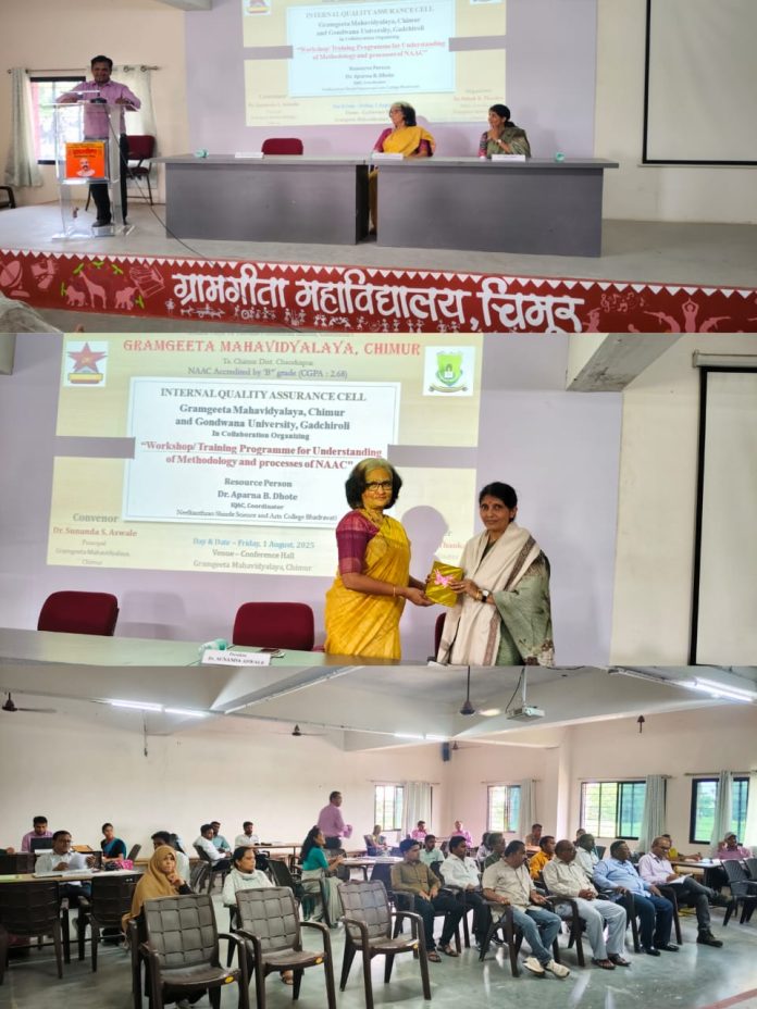 ग्रामगीता महाविद्यालय चिमूर येथे दिनांक १ ऑगस्ट २०२५ रोजी, परिस स्पर्श योजनेचा अंमलबजावणी करिता मेंटी संस्थांसाठी *’NAAC च्या पद्धती आणि प्रक्रिया समजून घेण्यासाठी कार्यशाळा/प्रशिक्षण कार्यक्रम’* आयोजित केला होता. या कार्यक्रमाचे अध्यक्षपद ग्रामगीता महाविद्यालय, चिमूरच्या प्राचार्या डॉ. सुनंदा अस्वले यांनी भूषवले, तर डॉ. अपर्णा धोटे, IQAC समन्वयक, एन. एस. कॉलेज भद्रावती आणि डॉ. निलेश ठवकर, IQAC समन्वयक, ग्रामगीता महाविद्यालय चिमूर हे या कार्यशाळेचे संसाधन व्यक्ती म्हणून उपस्थित होते. तसेच, मेंटी संस्थेचे क्रायटेरिया क्रमांक १ ते ७ चे प्रमुख, डॉ. वरद खटी, श्री. नागेश ढोरे, श्री. विवेक माणिक, श्री. संदीप मेश्राम, डॉ. मृणाल वऱ्हाडे, डॉ. बिजनकुमार शील आणि डॉ. युवराज बोधे हे मेंटी संस्थांच्या क्रायटेरिया प्रमुखांशी संबंधित निकषांवर चर्चा करण्यासाठी उपस्थित होते.