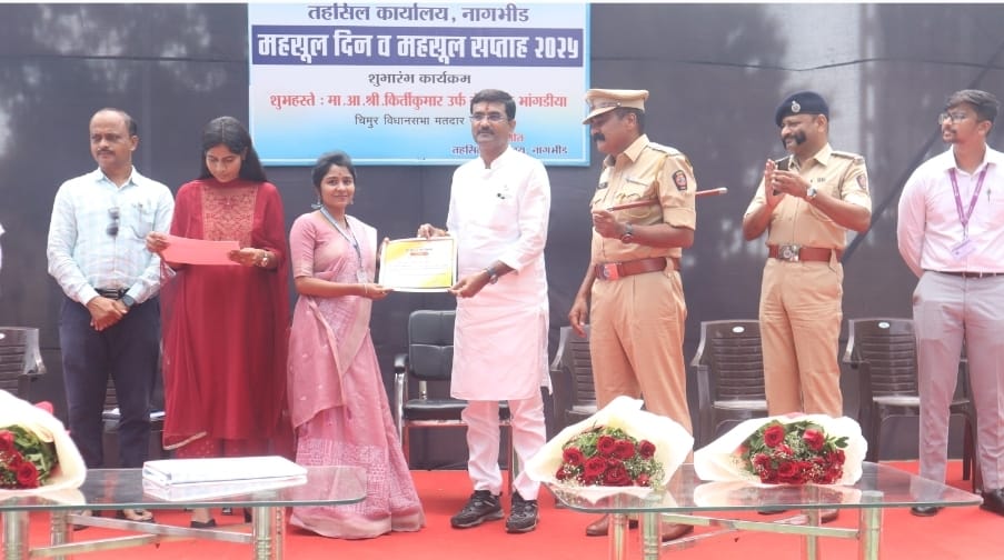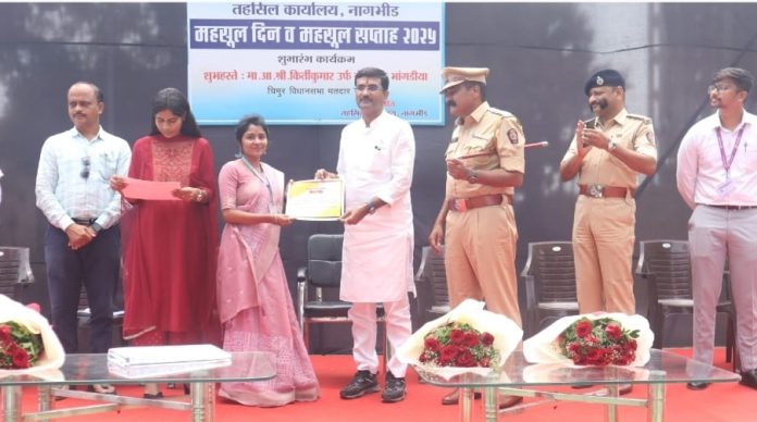 नागभीड-चंद्रपूर(दि.2ऑगस्ट):-राज्य शासनाच्या निर्देशाप्रमाणे 1 ऑगस्ट रोजी महसूल दिन तर 1 ते 7 ऑगस्ट 2025 या कालावधीत महसूल सप्ताह साजरा करण्यात येणार आहे. या सप्ताहात नागभीड तालुका प्रशासनातर्फे अभिनव उपक्रमांचे आयोजन करण्यात आले आहे. शुक्रवारी चिमूर विधानसभा क्षेत्राचे आमदार कीर्तिकुमार ऊर्फ बंटी भांगडीया यांच्या हस्ते महसूल सप्ताहाचा शुभारंभ करण्यात आला.