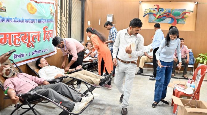 चंद्रपूर(दि.4ऑगस्ट):-महसूल विभागाकडून देण्यात येणा-या सेवा आणि विभागाकडून राबविण्यात येणा-या विविध योजनांबाबत नागरिकांमध्ये जागरुकता वाढावी, शासनाबद्दल आणि शासनाच्या कामकाजाबद्दल नागरिकांचा विश्वास वृध्दिंगत व्हावा, यासाठी विशेष मोहीम व लोकाभिमुख उपक्रम राबविण्याच्या उद्देशाने 1 ते 7 ऑगस्ट या कालावधीत महसूल सप्ताह साजरा करण्याच्या सुचना शासनाने दिल्या आहेत. या अंतर्गत विविध उपक्रम राबविण्यात येत असून जिल्हाधिकारी कार्यालय, उपविभागीय अधिकारी कार्यालय आणि तहसील कार्यालय चंद्रपूरच्या वतीने रक्तदान शिबीर व आरोग्य तपासणी शिबीर घेण्यात आले.