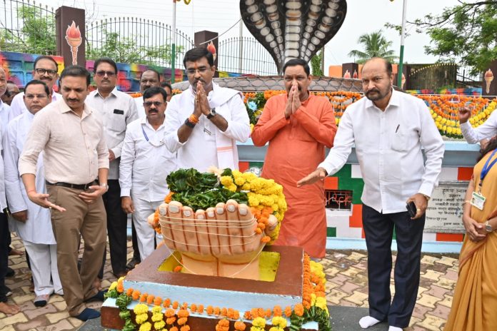 चिमूर(दि.16ऑगस्ट):-16 ऑगस्ट 1942 रोजी झालेल्या चिमूर क्रांती दिनानिमित्त आज राज्याचे आदिवासी विकास विभागाचे मंत्री तथा चंद्रपूर जिल्ह्याचे पालकमंत्री डॉ. अशोक उईके यांनी शहिदांना श्रध्दांजली वाहिली. यावेळी त्यांनी चिमूर येथील हुतात्मा स्मारक आणि किल्ला परिसरातील शहीद स्मारक तसेच राष्ट्रसंत तुकडोजी महाराज, महात्मा ज्योतिबा फुले, सावित्रीबाई फुले आणि शहीद बालाजी रायपूरकर यांच्या पुतळ्याला पुष्पचक्र अर्पण करून अभिवादन केले. यावेळी चिमूर विधानसभा क्षेत्राचे आमदार कीर्तिकुमार उर्फ बंटी भांगडीया, माजी खासदार अशोक नेते उपस्थित होते.