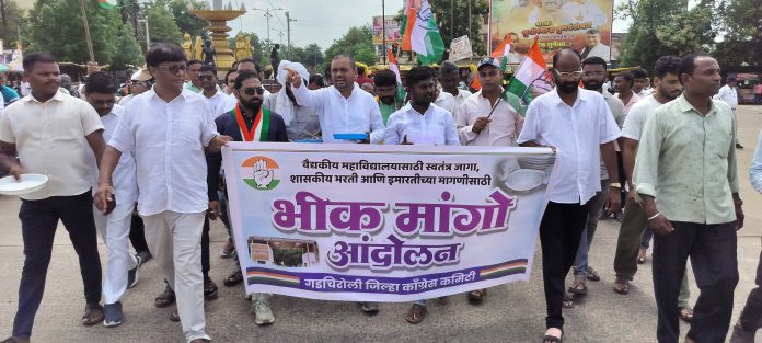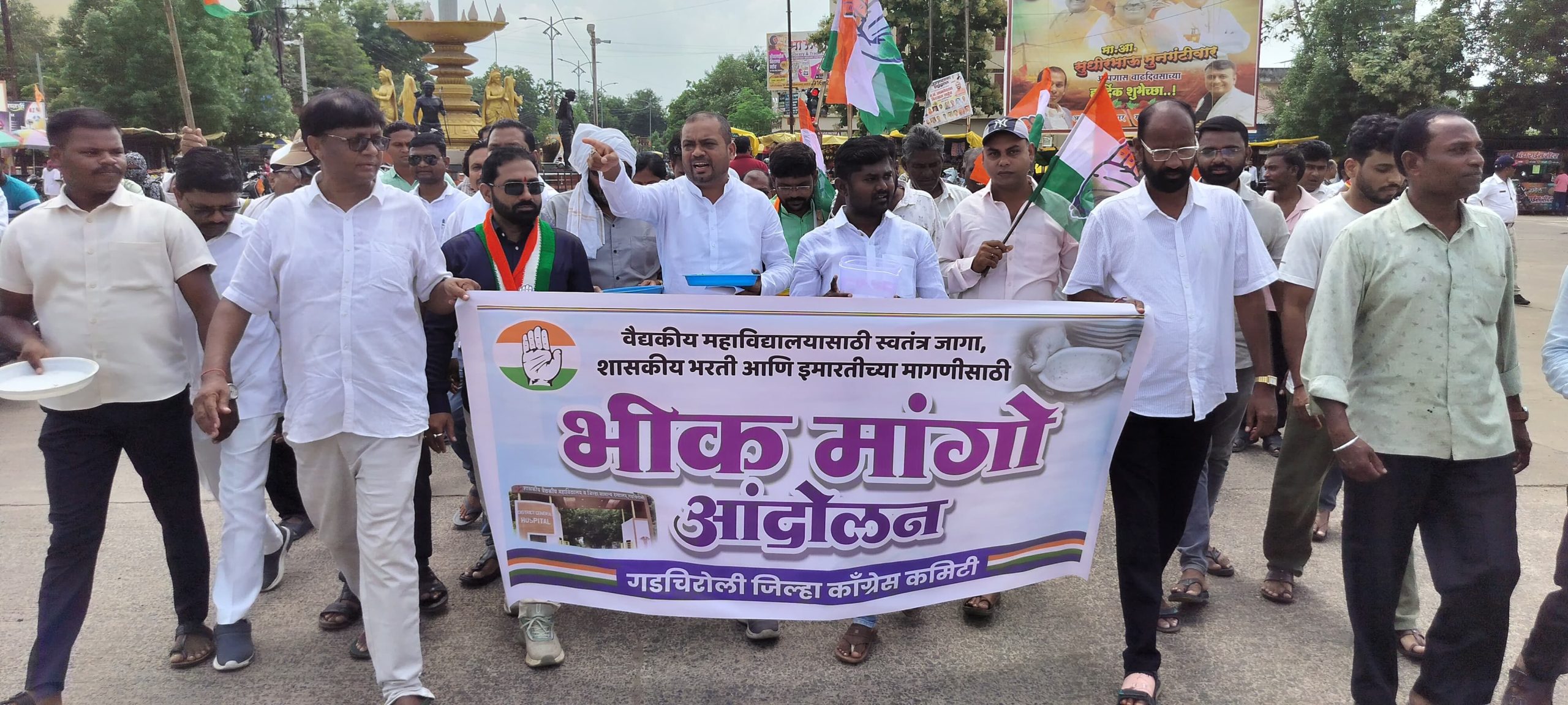 वैद्यकीय महाविद्यालयासाठी स्वतंत्र जागा, उपलब्ध करून, शासकीय यंत्रनेमार्फत नोकर भरती करण्याच्या प्रमुख मागणीसाठी गडचिरोली जिल्हा काँग्रेसचे ‘भीक मांगो’ आंदोलन