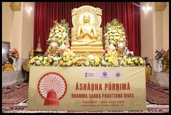 आषाढ़ पूर्णिमा , जिसे धर्म दिवस के रूप में भी जाना जाता है, आठवें चंद्र माह (आमतौर पर जुलाई) की पूर्णिमा के दिन मनाई जाती है। यह बुद्ध के पहले उपदेश, ” धर्म चक्र प्रवर्तन ” की याद में मनाया जाता है, जो उन्होंने ज्ञान प्राप्ति के बाद सारनाथ में अपने पांच तपस्वी शिष्यों को दिया था। इस उपदेश ने चार आर्य सत्य और अष्टांगिक मार्ग का परिचय दिया, बौद्ध शिक्षाओं की नींव रखी और मठवासी समुदाय (संघ) की स्थापना की। जुलाई 2025 में, अंतर्राष्ट्रीय बौद्ध परिसंघ ने संस्कृति मंत्रालय, भारत सरकार और महाबोधि सोसाइटी ऑफ इंडिया के सहयोग से, सारनाथ के मूलगंध कुटी विहार में आषाढ़ पूर्णिमा मनाई, जो धम्मचक्र प्रवर्तन दिवस को चिह्नित करता है – जब भगवान बुद्ध ने अपना पहला उपदेश दिया था। इस कार्यक्रम में दुनिया भर के मठवासी, विद्वान और श्रद्धालु शामिल हुए। इसकी शुरुआत धमेक स्तूप के चारों ओर परिक्रमा के साथ हुई और इसने वर्षा वासा के आरंभ का संकेत दिया, जो मठवासी वर्षावास है, जो आत्मनिरीक्षण और आध्यात्मिक विकास का प्रतीक है, तथा स्तूप बुद्ध की शिक्षाओं के शाश्वत सार को प्रसारित करता है।