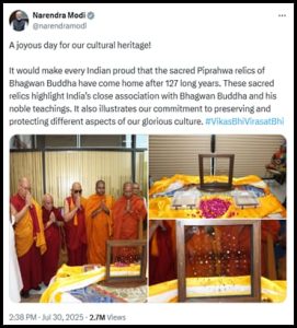 प्रधानमंत्री नरेन्द्र मोदी ने 127 वर्षों के बाद भगवान बुद्ध के पवित्र पिपरहवा अवशेषों को भारत वापस लाए जाने पर खुशी जताई और इसे देश की सांस्कृतिक विरासत के लिए गौरव का क्षण बताया।