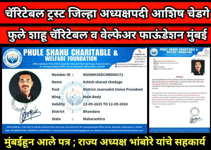 फुले शाहू चॅरिटेबल व वेल्फेअर फाऊंडेशन ही शासनमान्य व महाराष्ट्रातील अग्रगण्य संस्था आहे. यामध्ये या फाऊंडेशन कडून आरोग्य सुविधा, औषधी पुरवठा, अपंगत्व असलेल्या व्यक्तींना कृत्रिम हात पाय, खेळोत्तेजक प्रशिक्षणासाठी ५०% भांडवल, युवा बेरोजगारांना विविध रोजगार उपलब्ध, विधवा, तृतीयपंथींना ५०% भांडवल देत व्यवसाय संधी, गोरगरीब शेतकऱ्यांना कृषी साहित्य अवजारे, औषधी यात १०% भांडवल, चालकांना वाहन खरेदीसाठी ५०% भांडवल व २ लाखांचा अपघात विमा, शासन अनुदानित खेळ, प्रशिक्षण, स्पर्धा करीता ५०% भांडवल, कर्जबाजारी गरीब व्यक्तींना ५०% रक्कम फाऊंडेशनतर्फे देत त्यांना पुन्हा व्यवसायात खंबीर करणे अश्या विविध सेवाकार्य ही राज्यस्तरीय फुले शाहू चॅरिटेबल व वेल्फेअर फाऊंडेशन संस्था करीत आहे. आज महाराष्ट्र शासन मान्य प्रेस संपादक व पत्रकार सेवा संघ महाराष्ट्र राज्य सरचिटणीस संजीव भांबोरे यांनी साकोली येथील श्रमिक पत्रकार तथा पत्रकार सेवा संघ जिल्हा अध्यक्ष आशिष चेडगे यांचे नाव मुंबईला सुचविले. त्यातच त्यांची नियुक्ती मुख्य कार्यकारिणी मध्ये “भंडारा जिल्हा अध्यक्ष” या पदावर नियुक्ती करण्यात आली आहे. तसे पत्र आज साकोलीत त्यांना प्राप्त झाले. नवनियुक्त अध्यक्ष आशिष चेडगे यांनी सांगितले की, आता कोणत्याही गोरगरीब जनता, विधवा महिला, युवा सुशिक्षित बेरोजगार, दिव्यांग व्यक्ती, गरीब शेतकरी व सामान्य व्यापारींना यापुढे त्रास होणार नाही. आणि सदर फाऊंडेशन सातत्याने भंडारा जिल्ह्यातील प्रत्येक तालुक्यात आपले सदस्यगण नोंदणी पूर्ण करीत यांचा प्रत्येक सामान्य जनतेला लाभ दिला जाईल असे सांगितले.