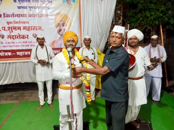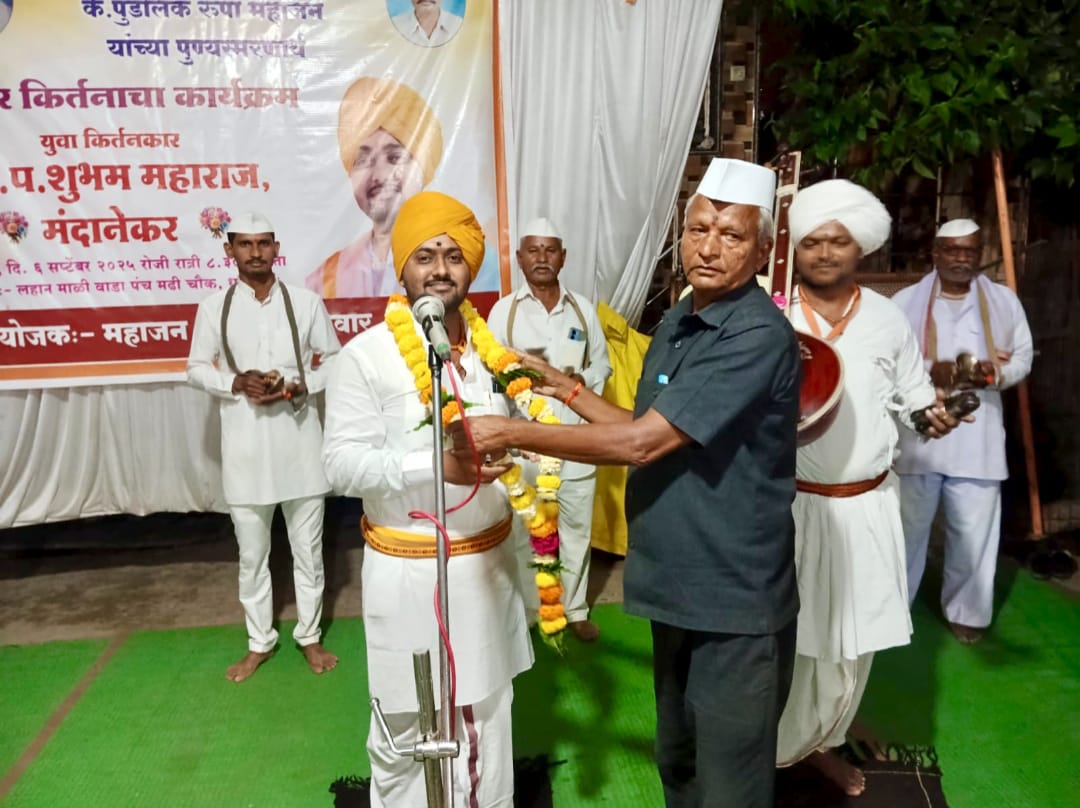 नुकत्याच येथील जेष्ठ सामाजिक कार्यकर्ते व दैनिक तरूण भारत चे पत्रकार कडू महाजन यांचा मातोश्री स्वर्गीय अनुसयाबाई रुपा महाजन व लहान बंधु स्वर्गीय पुंडलिक रुपा महाजन यांचा स्मृतिप्रीत्यर्थ किर्तनकाराचा कार्यक्रम संपन्न झाला त्या प्रसंगी ह.भ.प.मंदाणेकर महाराज बोलत होते,आपल्या दोन तासाचा किर्तनातुन त्यांनी सामाजिक प्रोबधन करुन संत व महात्म्याचे विचार सादर केले व वारकरी संप्रदाय हा जगात श्रेष्ठ असल्याचे नमुद संत विचारांची जिवनगाथा सादर केली.प्रारंभी ह.भ.प.स्वप्नील महाराज व टाळकरी भजनी मंडळाचे कुंकू बुक्का लाऊन सर्वाचे जेष्ठ पत्रकार कडू महाजन व परीवाराचा वतीने स्वागत करण्यात आले
