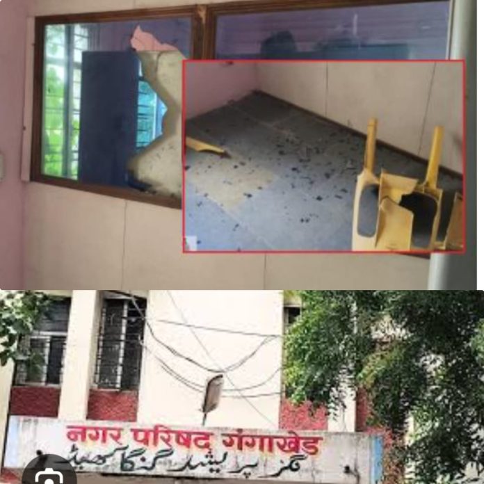 गंगाखेड नगर पालिकेत मुख्यधिकारी यांची जुनी कॅबिन असलेल्या, सद्या लेखाविभागाशी संबधीत कॅबिन मध्ये लेखापाल शिवम धूत हे शासकीय कामकाज करत असताना त्याच वेळी प्राप्त माहिती नुसार कॅबिन मध्ये आलेल्या नागरिकांने अधिकाऱ्याशी बिला संदर्भात शाब्दिक वाद झाला या वादा मुळे संबधीत नागरिकांने मंगळवारी सकाळी 11ते 11.30 वाजण्याच्या सुमारास या वादतून कॅबिनचे काच खुर्ची, व पाण्याचा जार याची तोडफोड झाल्याची घटना घडल्या मुळे कार्यालयात मोठा गोंधळ उडाला होता, या घटनेची माहिती शहरा मध्ये हवा सारखी पसरली असून या घटने ची शहारा मध्ये जोरात चर्चा होताना दिसते. .