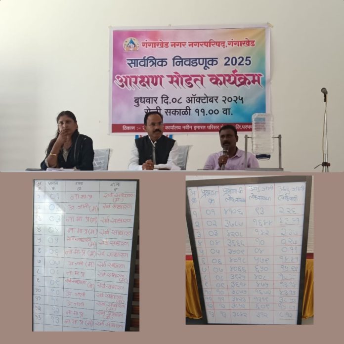 गंगाखेड(दि.9ऑक्टोबर):-नगर परिषद च्या सार्वत्रिक निवडणूक 2025 आरक्षण सोडत कार्यक्रम आज दिनांक 8 ऑक्टोबर 2025 रोजी उपजिल्हा कार्यालय गंगाखेड येथे उपविभागीय अधिकारी शिवराज डापकर, तहसीलदार सौ. उषकिरण श्रगांरे, मुख्यधिकारी जयवंत सोनवणे यांच्या उपस्थित 13 प्रभागा मधून 26 सदस्या साठी आरक्षण सोडत पार पडली यात अनुसूचित जाती साठी चार जागा सोडण्यात आल्या यात दोन महिला साठी व दोन पुरुष यासाठी सोडण्यात आल्या असून ना. मा. प्र. साठी सात जागा सोडण्यात आल्या आहेत.
