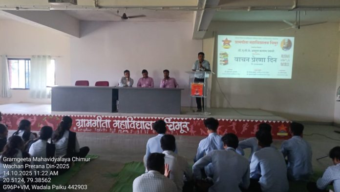 चिमूर(दि.16ऑक्टोबर):- स्थानिक ग्रामगीता महाविद्यालयात भारताचे ११ वे लोकप्रिय राष्ट्रपती व ‘मिसाइल मॅन ऑफ इंडिया’ म्हणून ओळखले जाणारे डॉ. ए. पी. जे. अब्दुल कलाम यांच्या ९४ व्या जयंतीनिमित्त वाचन प्रेरणा दिन उत्साहात साजरा करण्यात आला.