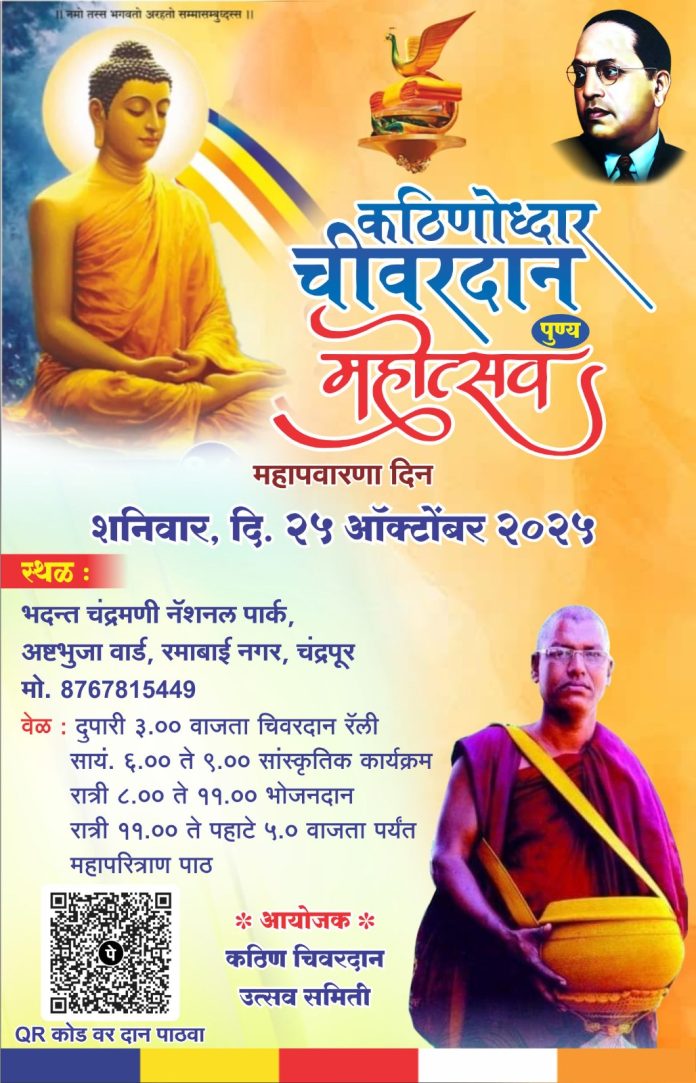 चंद्रपूर(दि.23ऑक्टोबर):-कठीण चिवरदान उत्सव समितीच्या वतीने भदन्त चंद्रमणी नॅशनल पार्क, अष्टभूजा वार्ड, रमाबाई आंबेडकर नगर चंद्रपूर येथे 25 ऑक्टोबर रोजी कठीणोद्धार चिवरदान पुण्य महोत्सव आयोजित करण्यात आला आहे.