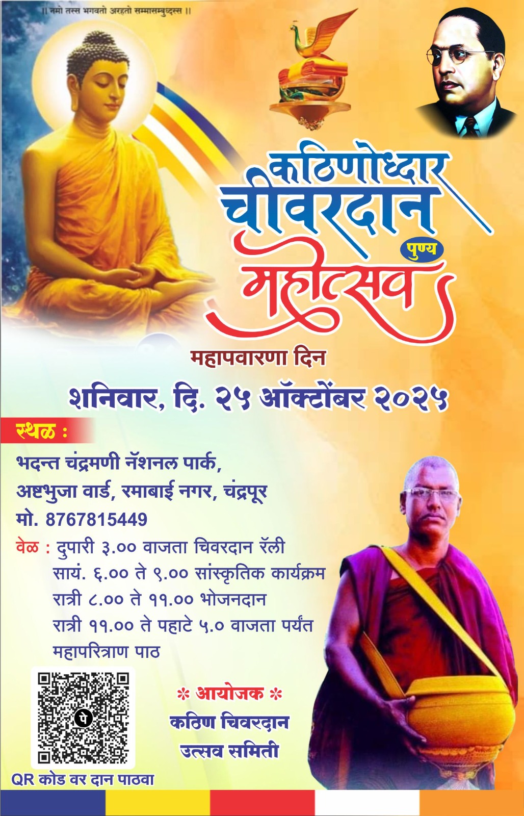 25 ऑक्टोबर रोजी दुपारी 3 वाजता चिवरदान रॅली, सायंकाळी 6वाजेपासुन रात्रौ 9 वाजेपर्यंत प्रबोधन कार्यक्रम व दरम्यान भोजनदान होईल. रात्रौ 11वाजेपासून पहाटे 5 वाजेपर्यंत महपरित्राण पाठ आयोजित करण्यात आला आहे. या मंगलमय कार्यक्रमात श्रद्धावान उपासकानी उपस्थित राहून तन-मन-धनाचे सहकार्य करण्यात यावे तसेच या बाबत सविस्तर माहिती करिता 8767815449 या मोबाईल क्रमांकावर संपर्क साधण्याचे आवाहन आयोजकांनी केले आहे.