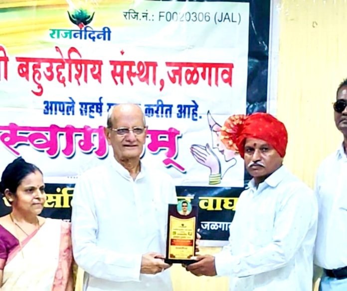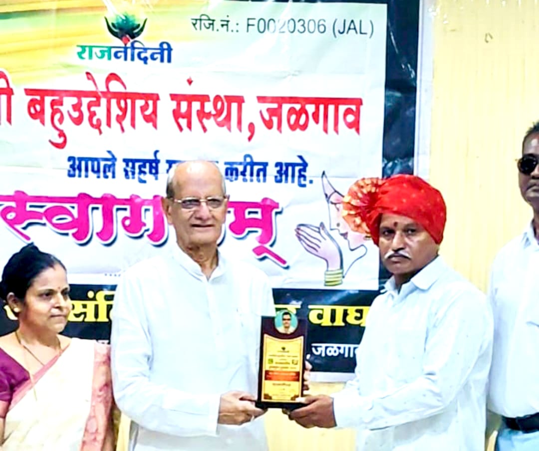 जळगाव येथे जिल्हाधिकारी कार्यालयातील अल्पबचत भवन येथे दि. २८ सप्टेंबर, २०२५ रविवार रोजी राजनंदनी बहुउद्देश संस्था जळगाव यांच्यातर्फे भैय्यासाहेब पाटील व डॉ.महेंद्र काबरा व मान्यवरांच्या हस्ते सत्यशोधक रवींद्र पितांबर महाजन यांना राज्यस्तरीय समाजभूषण पुरस्कार प्रशस्तीपत्र व सन्मानचिन्ह देऊन सन्मानित करण्यात आले. याप्रसंगी राजनंदिनी बहुउद्देशीय संस्थेचे पदाधिकारी तसेच कार्यकर्ते बहुसंख्येने उपस्थित होते.