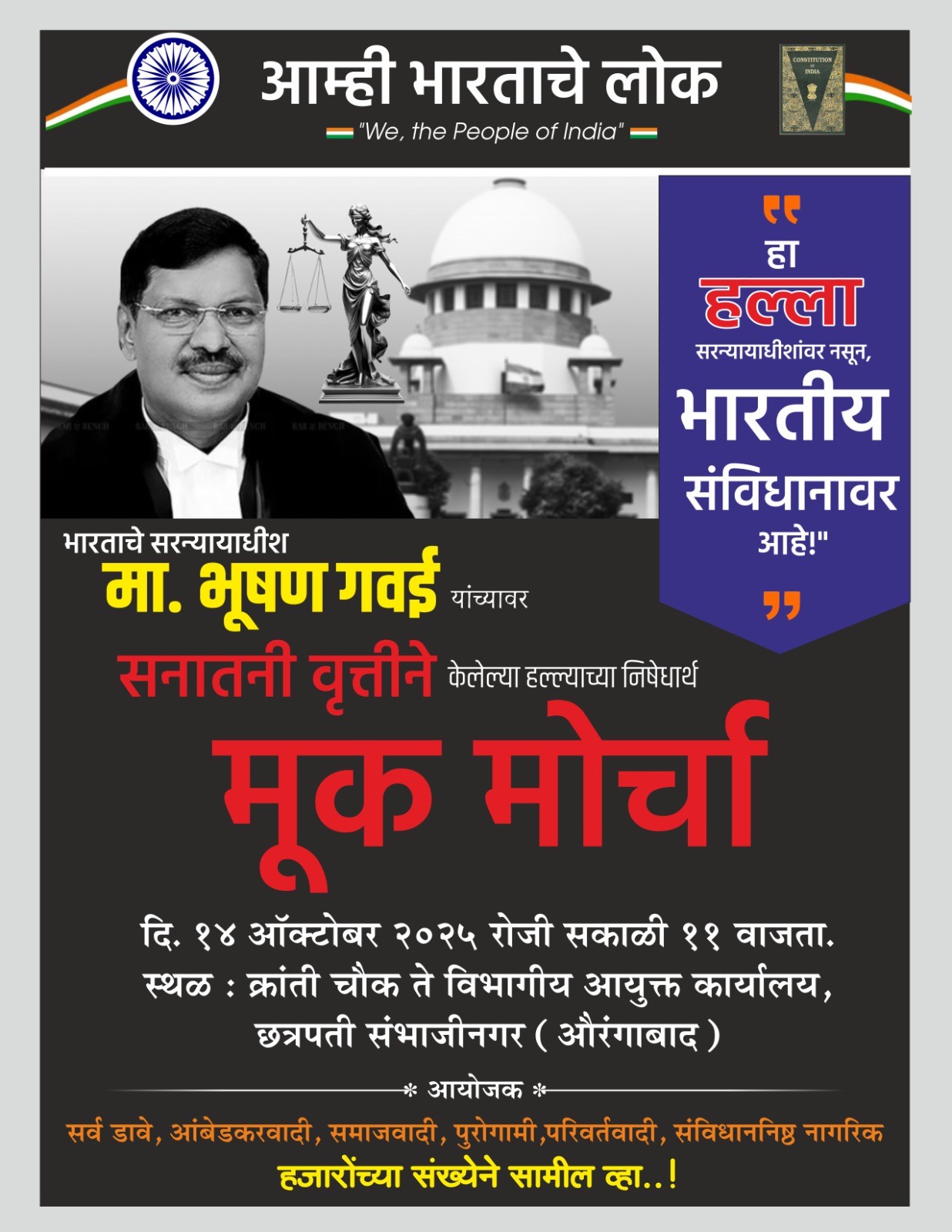 भारताच्या सरन्यायाधीशावरील हल्ल्याविरोधात १४ ऑक्टोबर रोजी भव्य मूक मोर्चा