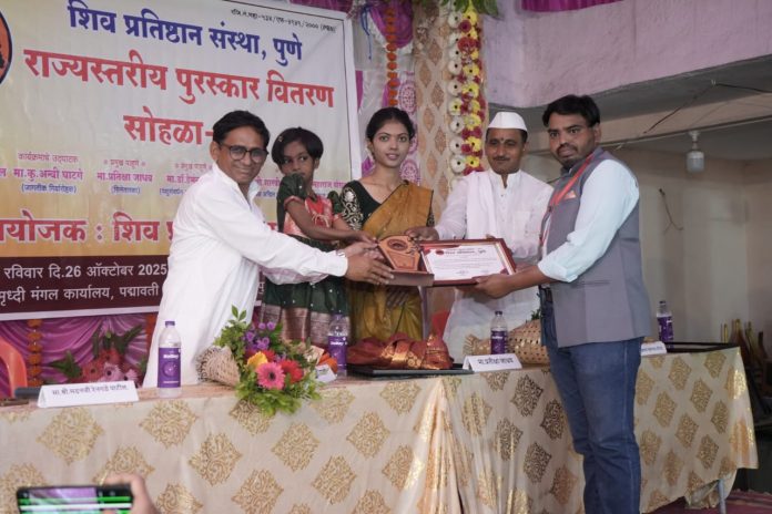म्हसवड(सातारा)(दि.2ऑक्टोबर):-शिवप्रतिष्ठान पुणे यांच्या संयोजनाने पुणे (देवाची आळंदी) येथे पार पडलेल्या राज्यस्तरीय महाराष्ट्र पुरस्कार सोहळ्यामध्ये पिंगळी बु!! येथील युवा लेखक – दिग्दर्शक अमर शिंदे यांना महाराष्ट्र कला रत्न या पुरस्काराने सन्मानित करण्यात आले.