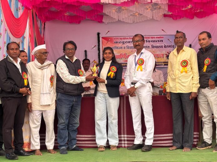 त्यावेळी मान्यवरांच्या हस्ते कस्तुरबा गांधी विद्यालय तथा कनिष्ठ महाविद्यालयाची माजी विद्यार्थिनी तथा भारतीय आट्यापाट्या संघाची कर्णधार तथा सुवर्णपदक विजेती कु. प्राची चटप हीचा शाल, स्मृतिचिन्ह व पुष्पगुच्छ देऊन सत्कार करण्यात आला.