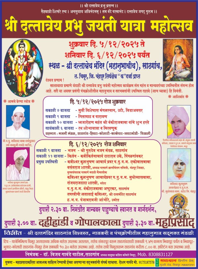 दरवर्षी प्रमाणे यावर्षीही श्रीदत्त मंदिर साठगांव येथे श्रीदत्त जयंती यात्रा महोत्सव आयोजित केलेला आहे. त्यानिमीत्य दिनांक ०५ डिसेंबर २०२५ रोज शुक्रवारला रात्रौ ६.०० वाजता रथ शोभायात्रा तर दिनांक ०६ डिसेंबर २०२५ रोज शनिवारला दुपारी १२.०० ते ३.०० प्रवचन, किर्तन, गोपालकाला तर ३ ते ६.०० महाप्रसाद होईल. या निमित्ताने श्री विनोद गावंडे यांचा लेख वाचकांसाठी प्रकाशित करीत आहोत.-संपादक