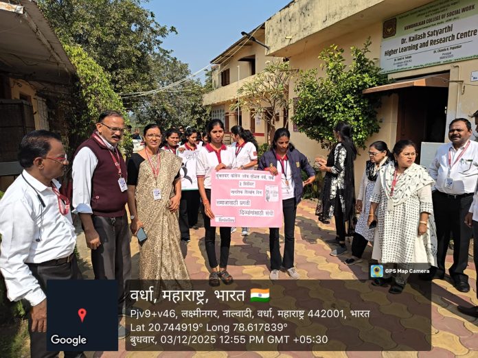 जगभरात दरवर्षी ३ डिसेंबर हा जागतिक दिव्यांग दिन साजरा केला जात असल्यामुळे *सेवार्थ, सी.एस. आर. आणि सोशल इम्पॅक्ट सेल* च्या माध्यमातून शाश्वत विकासाची ध्येय गाठता यावी म्हणून कुंभलकर कॉलेज ऑफ सोशल वर्क वर्धा, महाविद्यालयात जागतिक दिव्यांग दिनाच्या कार्यक्रमाचे आयोजन करण्यात आले. दिनाचे औचित्य साधून महाविद्यालयात विद्यार्थ्यांना विशेष मार्गदर्शन म्हणून परिसंवाद आणि रॅली काढण्यात आली.