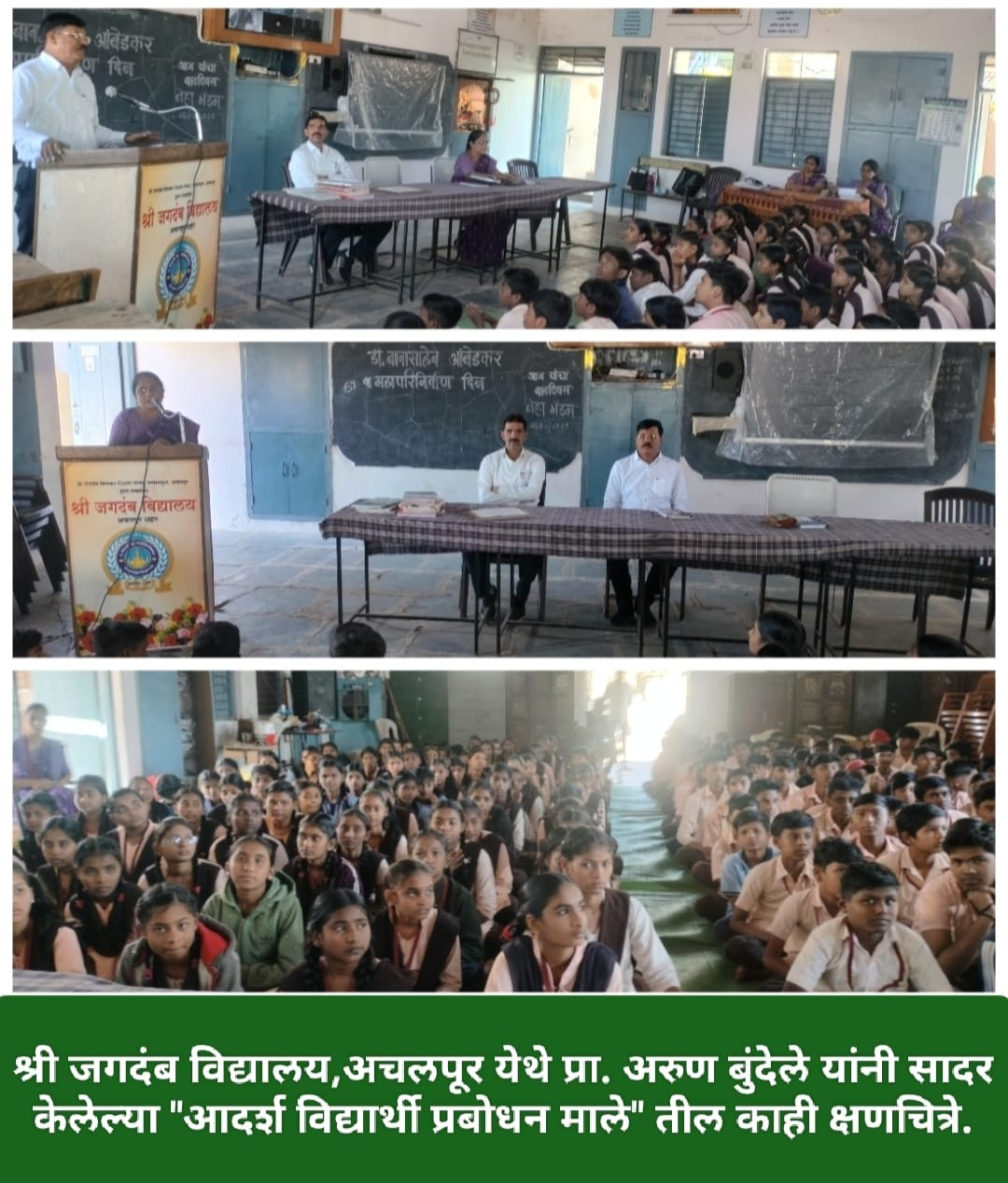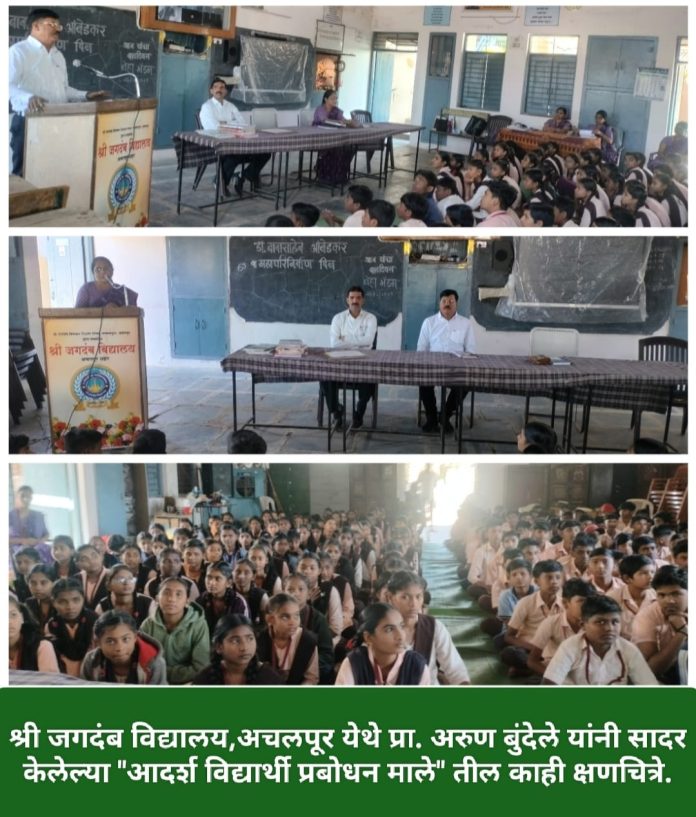 ते श्री जगदंब विणकर शिक्षण संस्था,अचलपूर द्वारा संचालित श्री जगदंब विद्यालय, अचलपूर येथे दि.१० डिसेंबर २०२५ ला कै.मैनाबाई बुंदेले स्मृती प्रतिष्ठान द्वारा आयोजित स्वनिर्मित ” आदर्श विद्यार्थी प्रबोधन माला ” हा विद्यार्थ्यांच्या गुणवृद्धिचा कार्यक्रम सादर करताना प्रमुख वक्ते पदावरून विचार व्यक्त करीत होते.