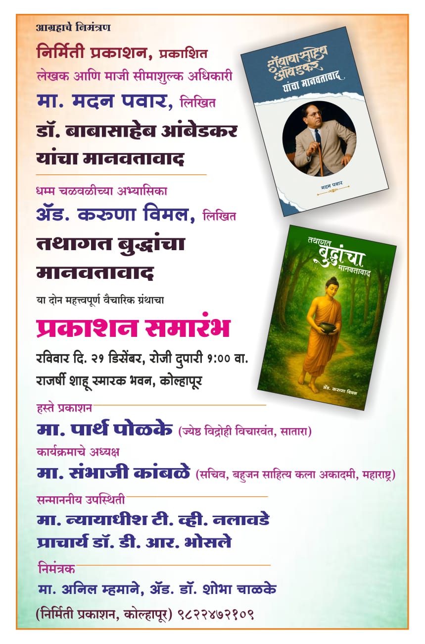 कोल्हापूर(दि.20डिसेंबर):-निर्मिती प्रकाशन, प्रकाशित ज्येष्ठ लेखक आणि माजी सीमाशुल्क अधिकारी मदन पवार, लिखित डॉ. बाबासाहेब आंबेडकर यांचा मानवतावाद आणि धम्म चळवळीच्या अभ्यासिका, अॅड. करुणा विमल, लिखित तथागत बुद्धांचा मानवतावाद या दोन महत्त्वपूर्ण वैचारिक ग्रंथाचा प्रकाशन समारंभ रविवार दि. 21 डिसेंबर, 2025 रोजी दुपारी 1:00 वा. राजर्षी शाहू स्मारक भवन, कोल्हापूर या ठिकाणी सातारचे ज्येष्ठ विद्रोही साहित्यिक व विचारवंत पार्थ पोळके यांच्या हस्ते होणार आहे.